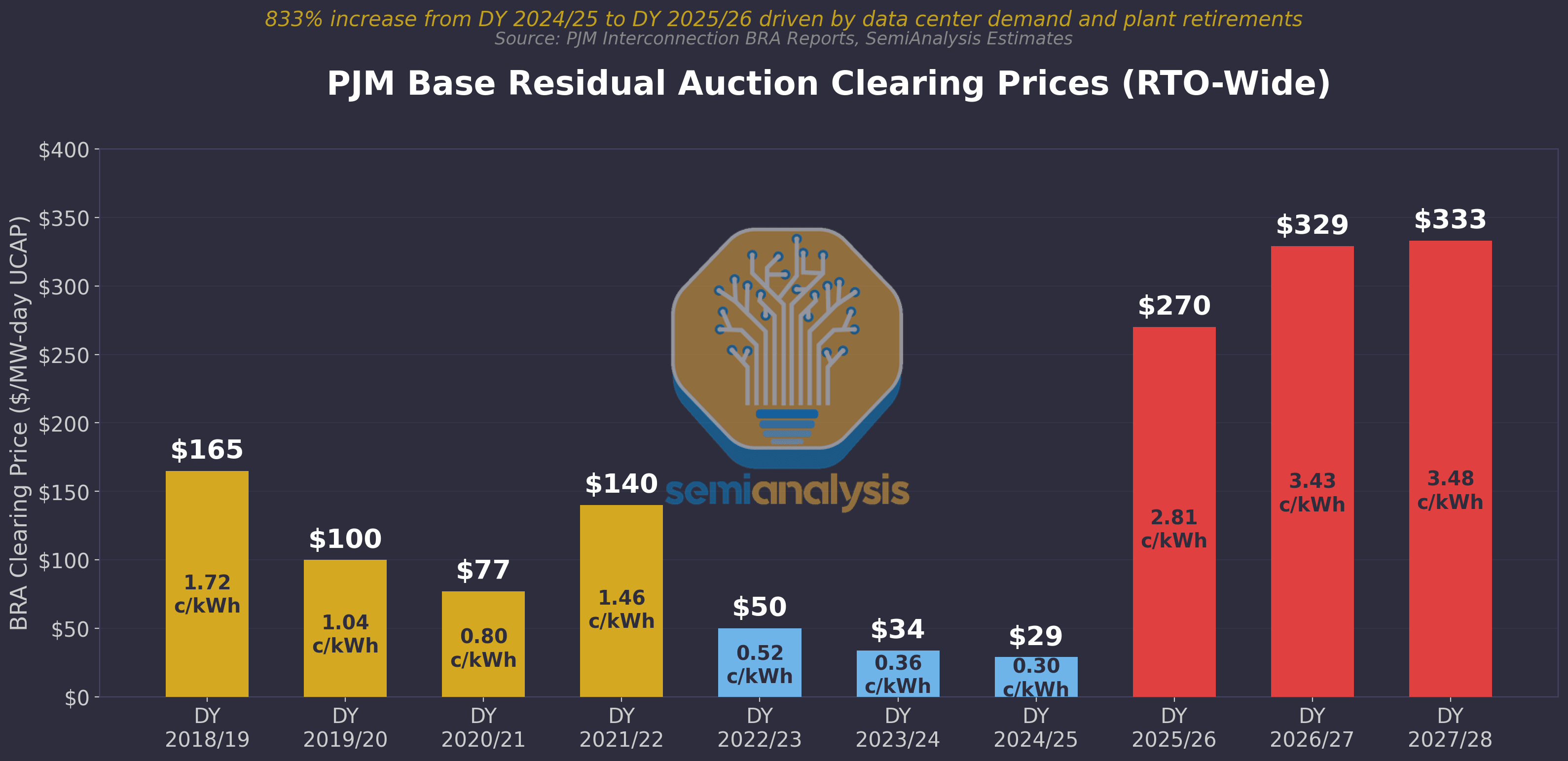 But that reliability now comes at an extraordinary price. Between June 2024 and May 2025 (the 2024/25 service period), capacity cost $29/MW-day. For the current 2025/26 service period, capacity jumped 9.3x to $270/MW-day, with select locations seeing prices closer to $450/MW-day. The subsequent 2026/27 and 2027/28 auctions continued clearing at record prices. It was widely believed that the price would be even higher, but the federal regulator imposed a price cap of $329/MW-day. The most recent auction, December 17th, 2025, hit the price cap for the second straight year.
