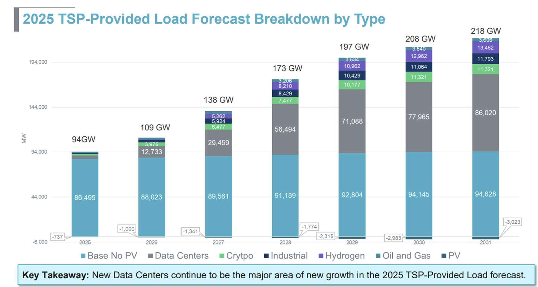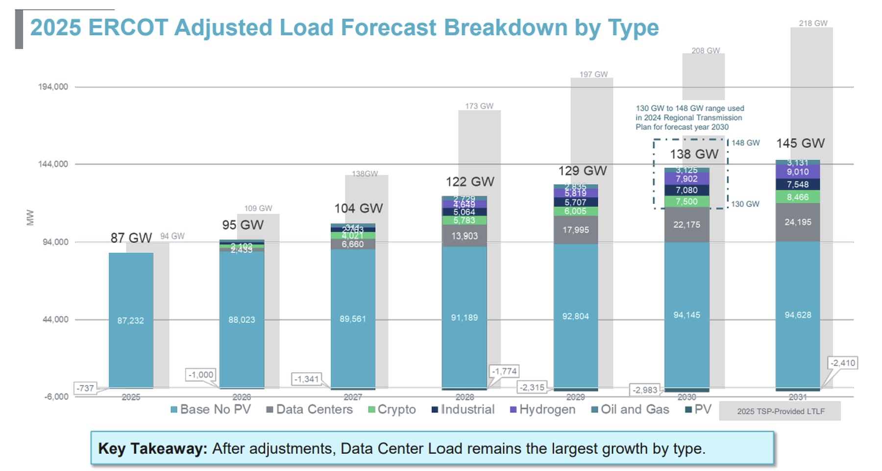 The physical system confirms ERCOT’s approach is working. The grid has already experienced record-breaking peaks of over 90 GW in summer 2024 and a spring record of 78.4 GW in May 2025. Hyperscaler demand growth in Texas is already enormous, and there have been no brownouts since.