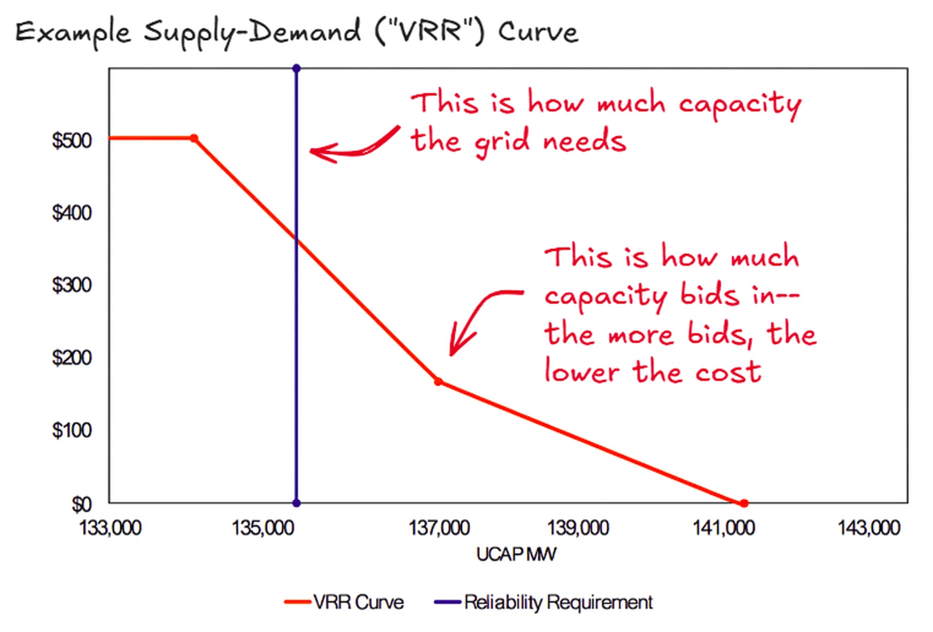 Capacity prices are based on an artificial supply-demand curve known internally as the Variable Resource Requirement (VRR) curve. The VRR curve is built on PJM’s internal forecast model, not on what the market thinks will happen. The projected increase in datacenter load shifted the clearing price on this curve, driving up prices independent of any public bid process.