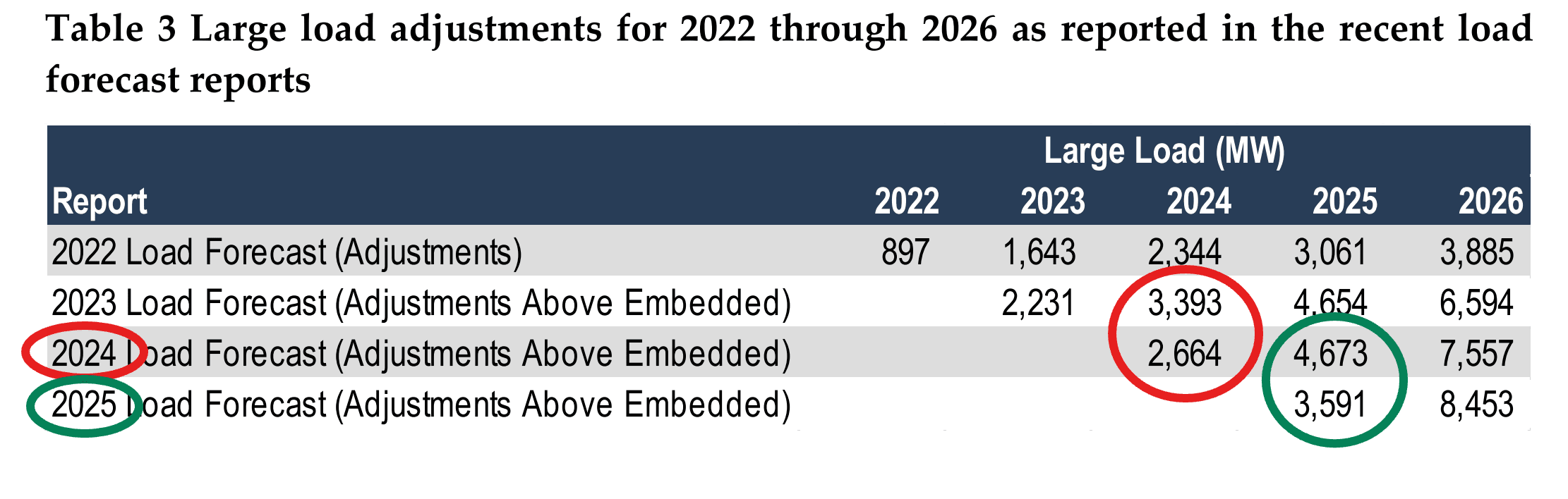 We show below a great example of this. PJM’s own data shows an inability to forecast even one year out. In 2024, the datacenter load forecast was cut by 800MW versus the 2023 load forecast. In 2025, it happened again: the datacenter load forecast was cut by 1.1GW versus what had been forecasted just a year ago, in 2024 !