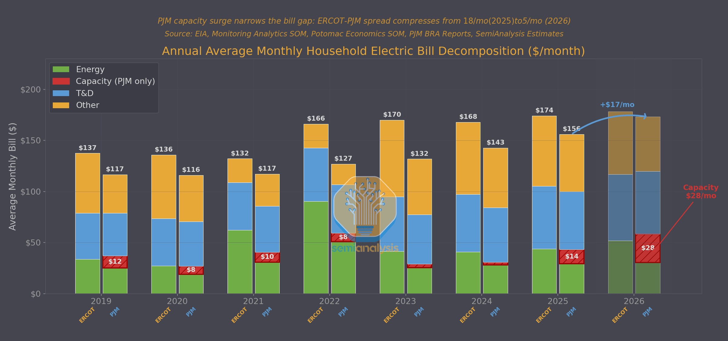 Capacity: This charge doesn’t exist in ERCOT but matters in PJM. It is a function of supply & demand for capacity, i.e. power that will only turn on a few hours per year, at necessary peak events. In PJM, this charge is defined annually via a large auction.