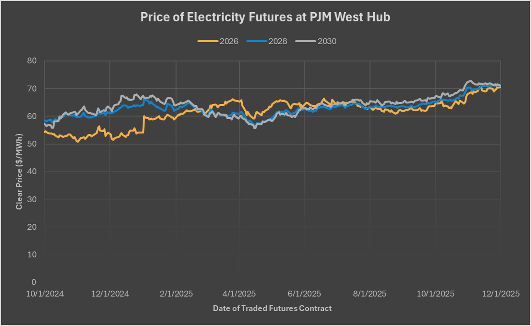 The prices that energy traders see have not gone to the moon either. Forward prices -- particularly 2026, 2028, and 2030 contracts -- have increased 11-17% in the past year, a notable increase and roughly similar to that of PJM, but no 9x surge in capacity prices.