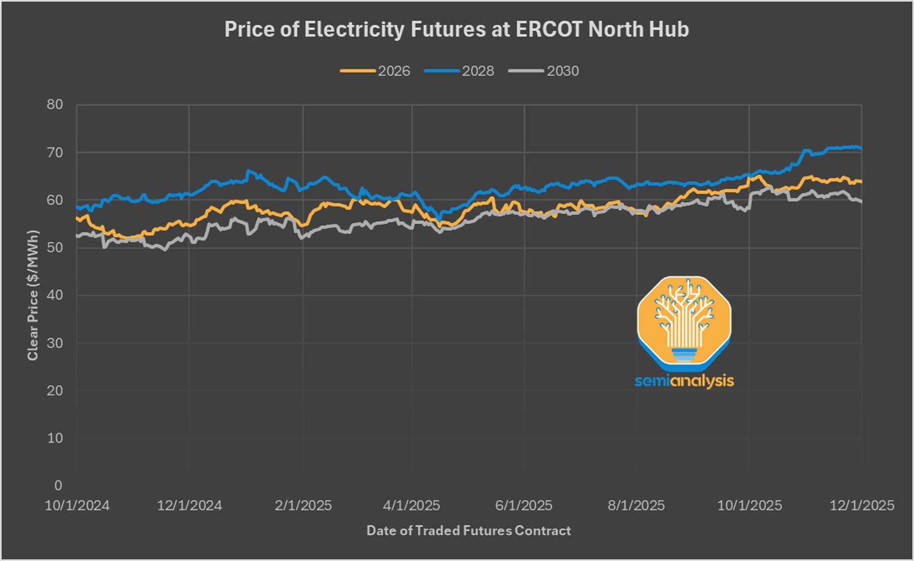 Now look at Texas. The state is witnessing an equivalent AI buildout, with OpenAI, Google DeepMind, Anthropic all building massive facilities. Yet power futures in Texas have moved only a few percent in the past year. No 9x spike, no crisis, very different market design.