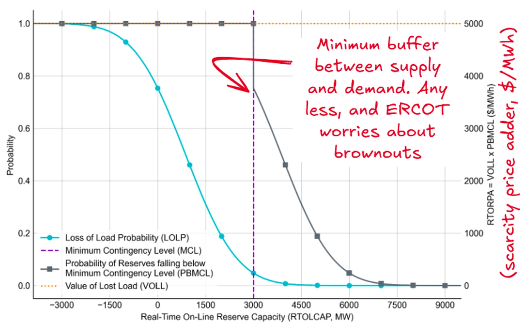 This scarcity-price structure allows capacity resources that run fewer than 100 hours per year (gas peaker plants, batteries, etc) to pay for themselves, because that handful of run-hours can still be worth millions of dollars in annual revenue to a 50 MW power plant or battery system.