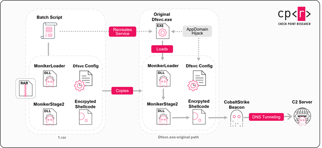 The dfsvc.exe.config file overwrites the AppDomain entry point, redirecting execution to MonikerLoader. By placing this malicious config file in the same directory as the legitimate Windows utility dfsvc.exe, it is ensures that MonikerLoader is loaded every time dfsvc.exe is executed, leveraging a technique known as AppDomain hijacking. The batch script then deletes and recreates the legitimate DfSvc service to force a new execution of dfsvc.exe, thereby triggering the malicious loading sequence.