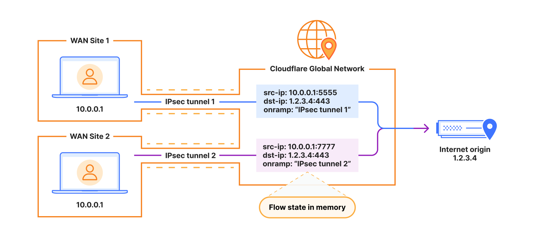 Example of overlapping source IPs tracked by in-memory flow state, tagged with source onramp to inform return routing decision.