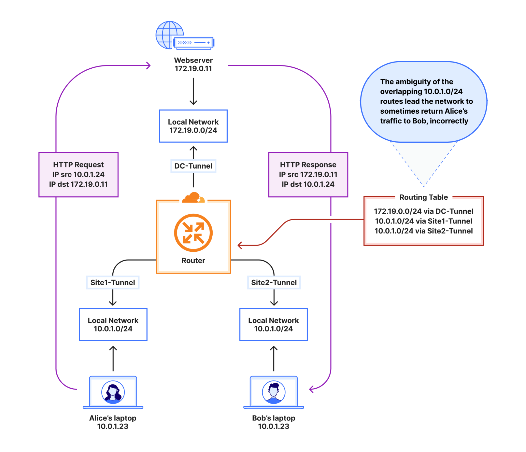 This diagram shows two branches (Site A and Site B) both using 10.0.1.0/24. They send packets to Cloudflare. The return packet from the Internet reaches the Cloudflare edge, and this return traffic is sometimes sent to the wrong site because the routing table has two identical egress options.