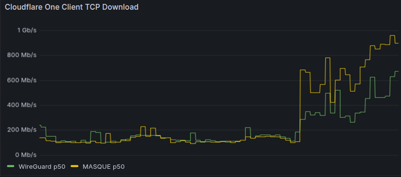 In September 2025, we deployed Unified Routing mode internally for all Cloudflare employees and sites. We saw immediate 3-5x performance improvements for Cloudflare One Clients, as you can see in the graph above.