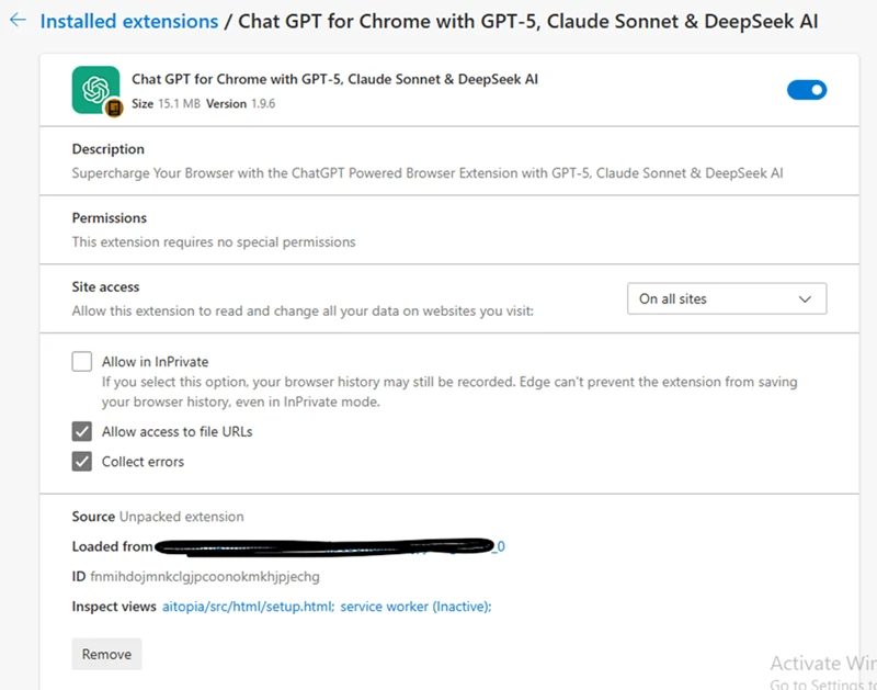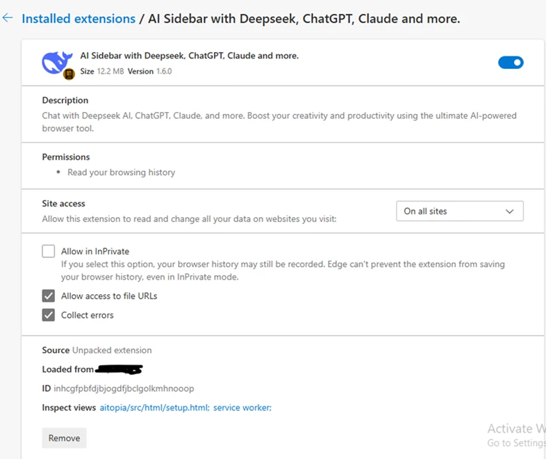 Following installation, the extension leveraged the Chromium extension permission model to begin collecting data without further user interaction. The granted permissions provided visibility into a wide range of browsing activity, including internal sites and AI chat interfaces.